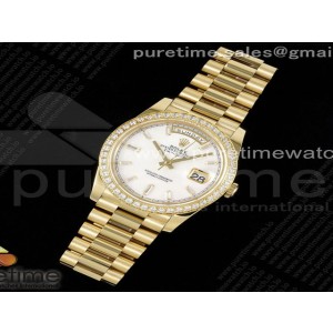 JD공장 롤렉스 데이데이트 화이트 다이아인덱스 다이아베젤 40 옐로우골드 _ Day Date 40 YG 904L Steel JDF 11 Best Edition White MOP Dial Diamonds Bezel on YG Bracelet A2836 > 롤렉스I데이데이트